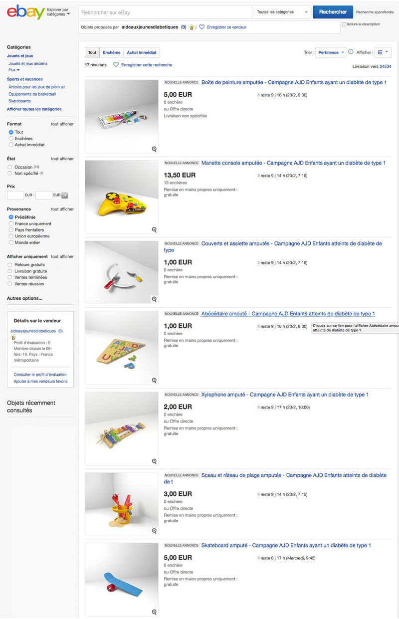Accompanied by a donation and awareness campaign in the Paris Metro and major cities In a partnership with Ebay France, fifteen amputated toys are put up for auction, the proceeds being donated directly to AJD.